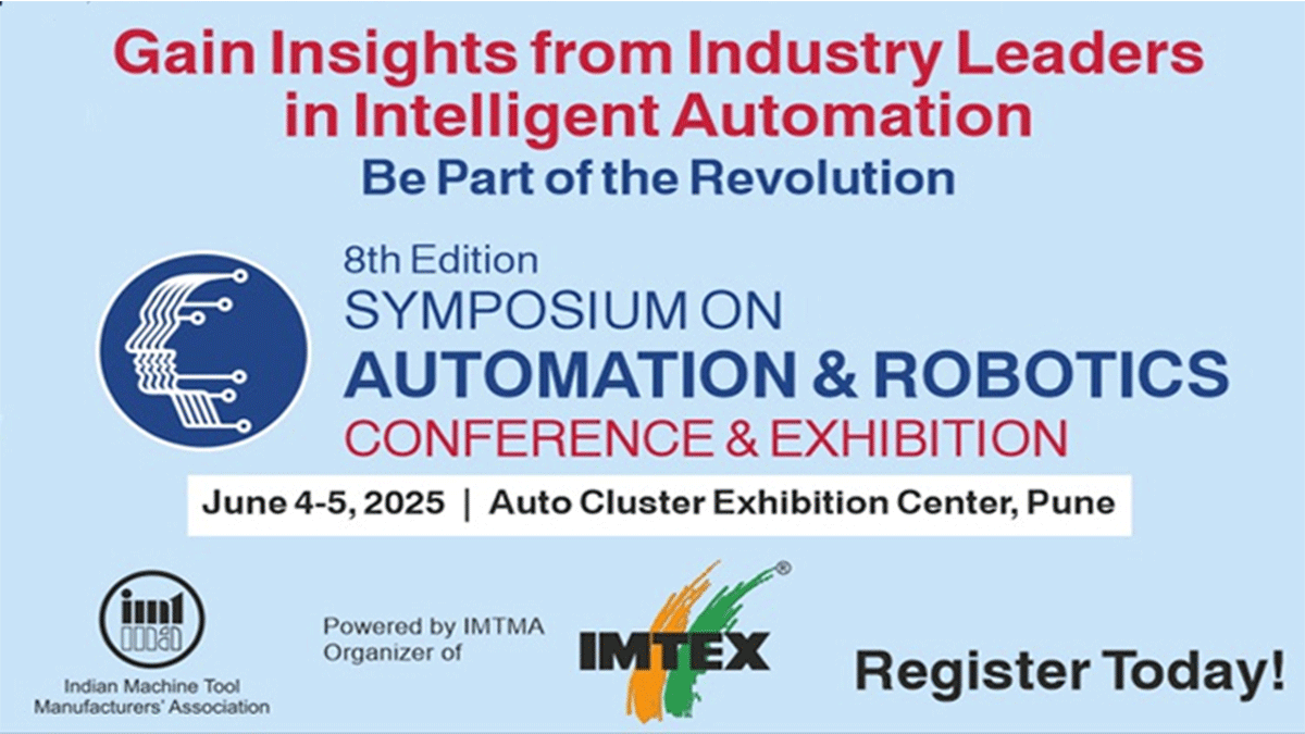 Bengaluru, 29 May 2025: Indian Machine Tool Manufacturers’ Association (IMTMA) is all set to organize the 8th edition of its flagship mega event, Symposium on Automation & Robotics (Conference and Exhibition) on 4 – 5 June 2025 at Auto Cluster Exhibition Center, Pune.